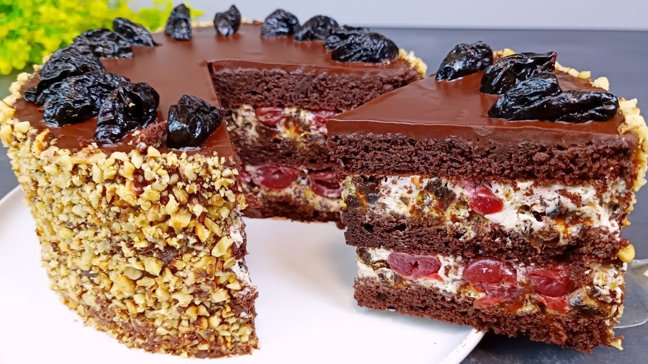 Готовим домашний торт с черносливом, грецкими орехами, шоколадом и вишней. Это невероятно вкусно!