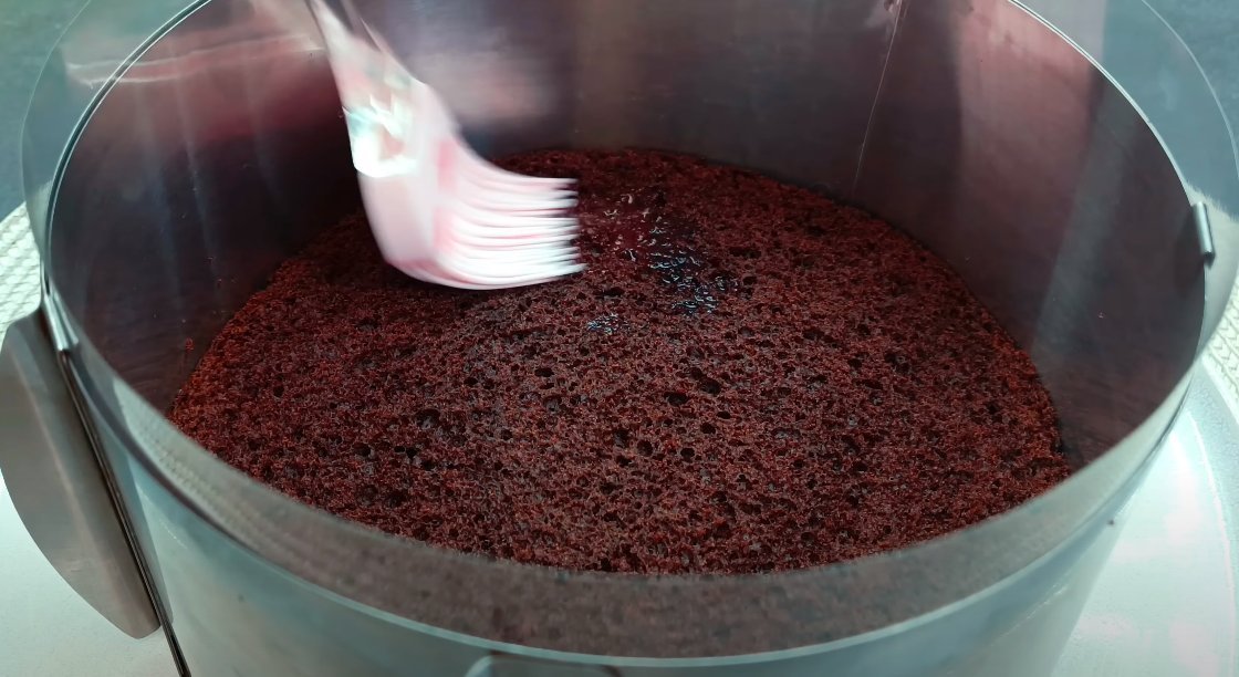 ШАГ 8: Готовый корж разрезаем на 3 части. Для пропитки используем вишневый сок или сироп.