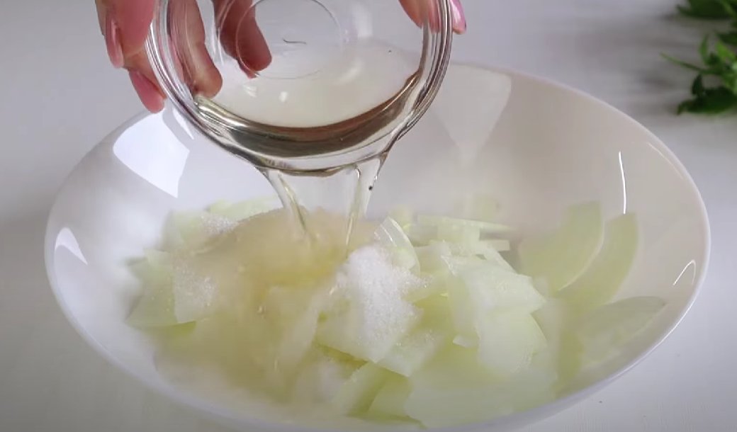 ШАГ 1: Замаринуем лук. В этом салате он нужен обязательно! Лук нарежем полукольцами. Добавим сахар, соль, яблочный уксус и воду. Оставим промариноваться на 20-30 минут.