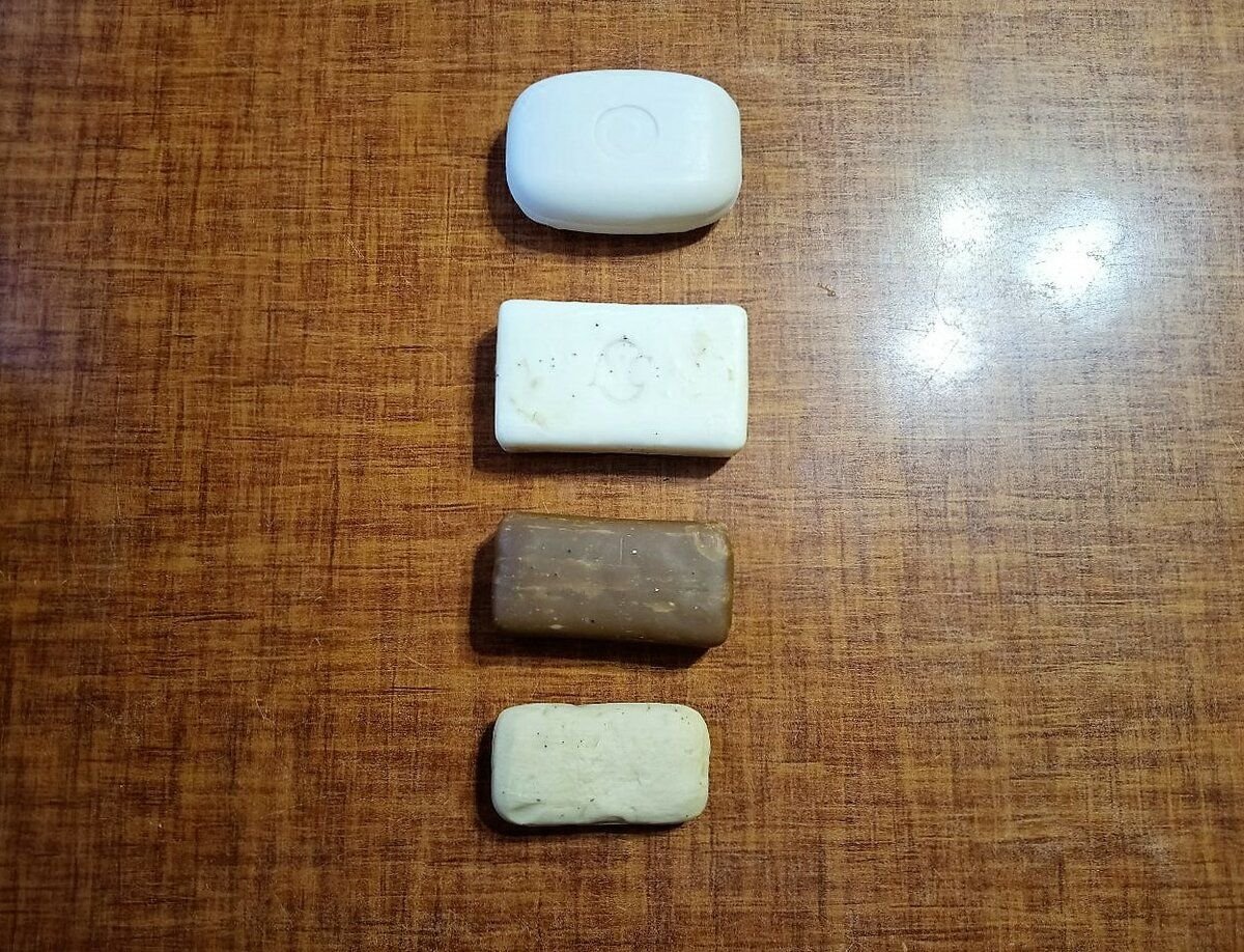 Вот такое мыло сейчас я использую. Сверху первое — новый кусочек для рук, ниже для выведения пятен с одежды, далее дегтярное мыло — для умывания сына-подростка, и последний кусочек — обмылок.