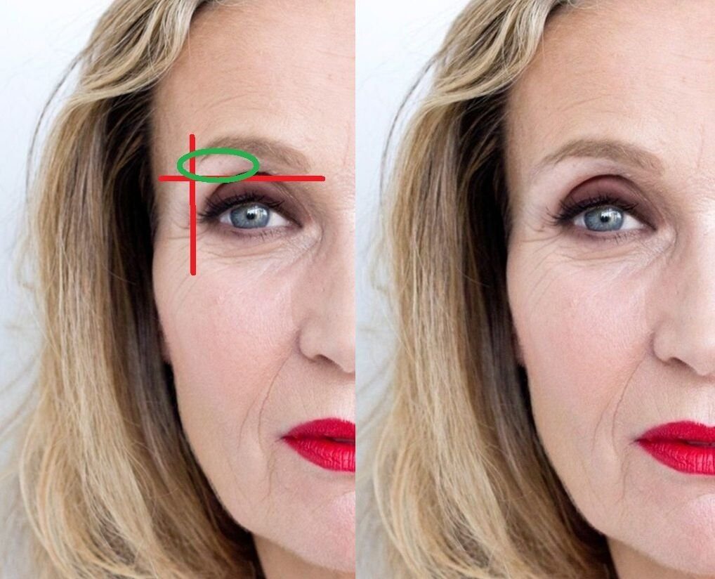 Ошибка, которую допускают в основном женщины среднего и старшего возраста, — это высветление области под бровью. Почему ее допускают в основном женщины старшего возраста? Потому что с возрастом у многих брови и веки принимают такое положение, которое и способствует неправильному нанесению косметики. Объясню, что я имею в виду…