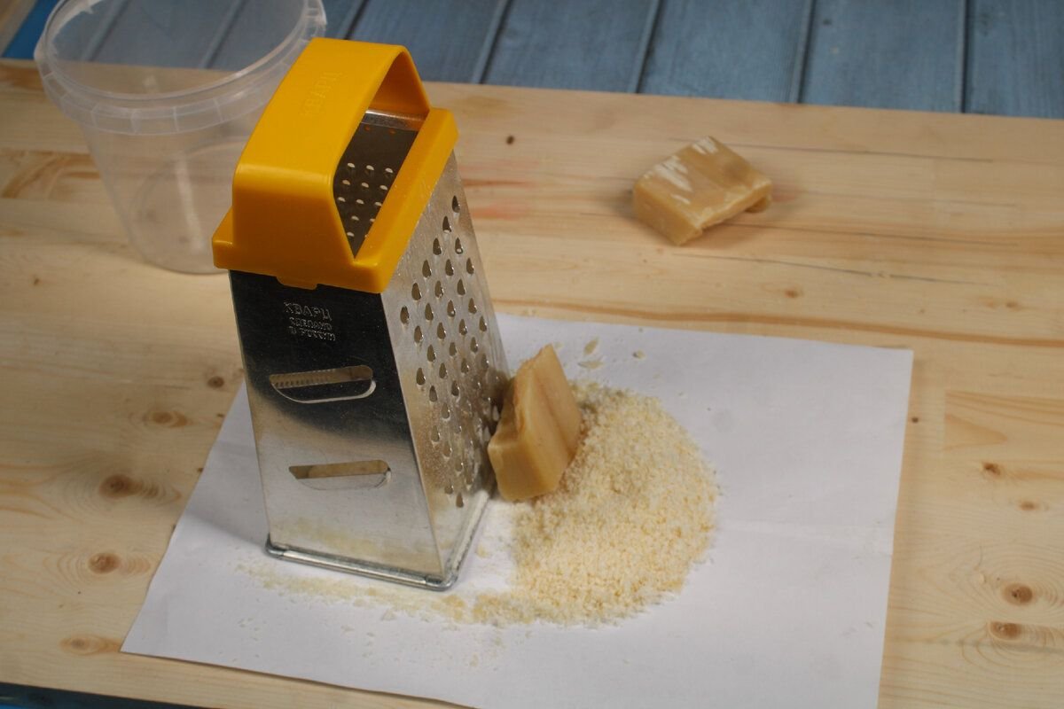 Натираем мыло на крупной тёрке и помещаем в любую ёмкость.