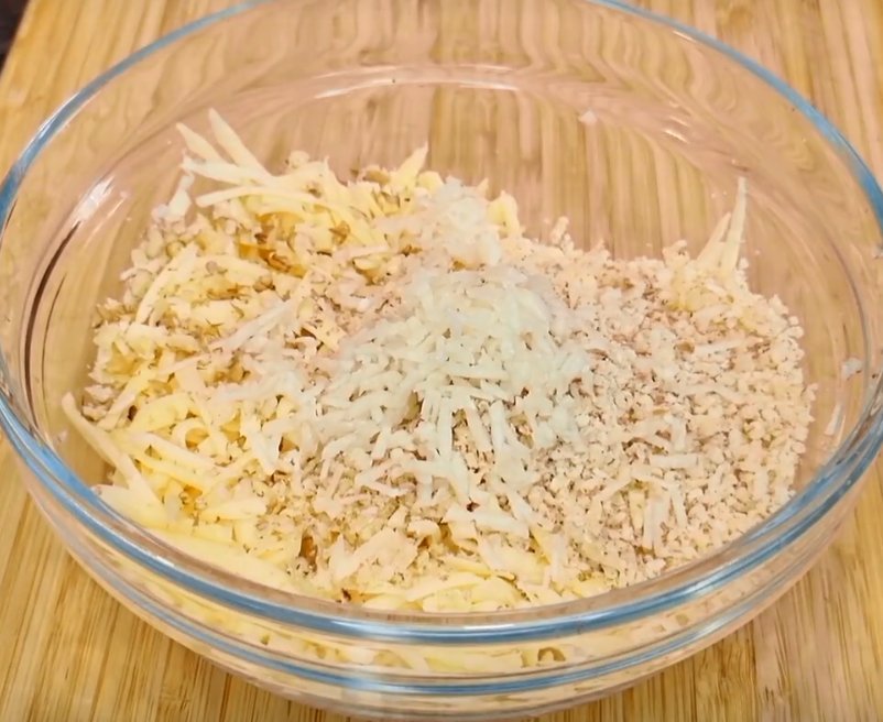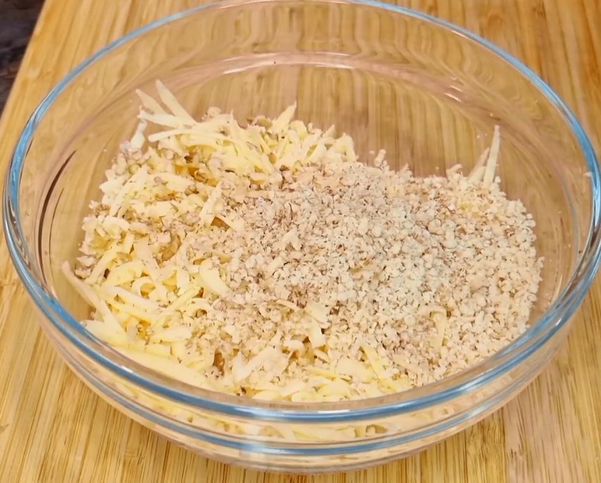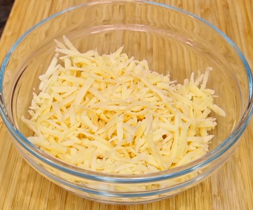 Шаг 2: сыр (100 гр.) натереть на тёрке, положить в отдельную емкость.