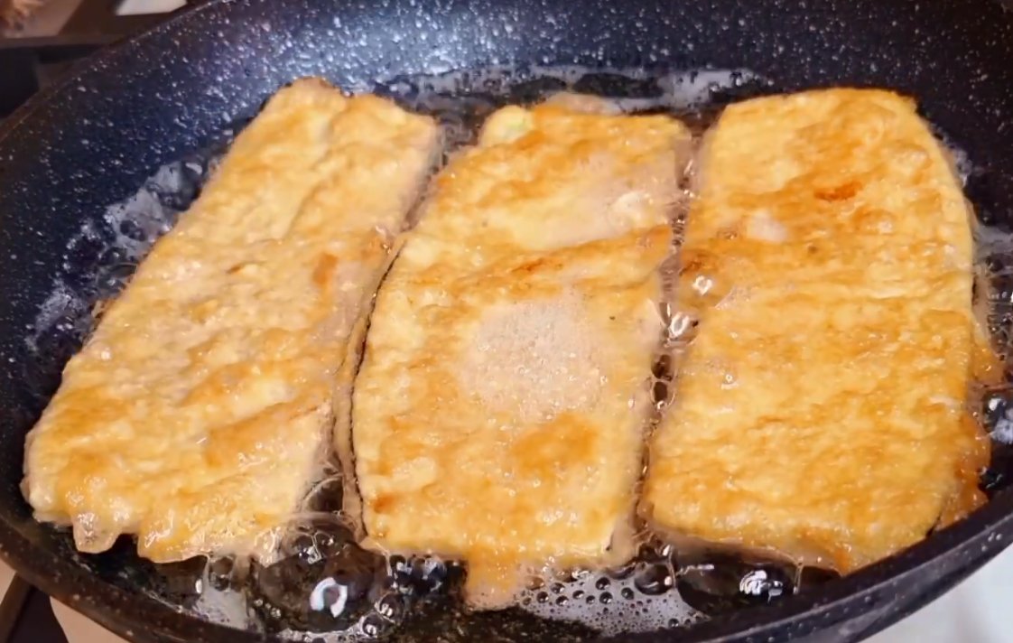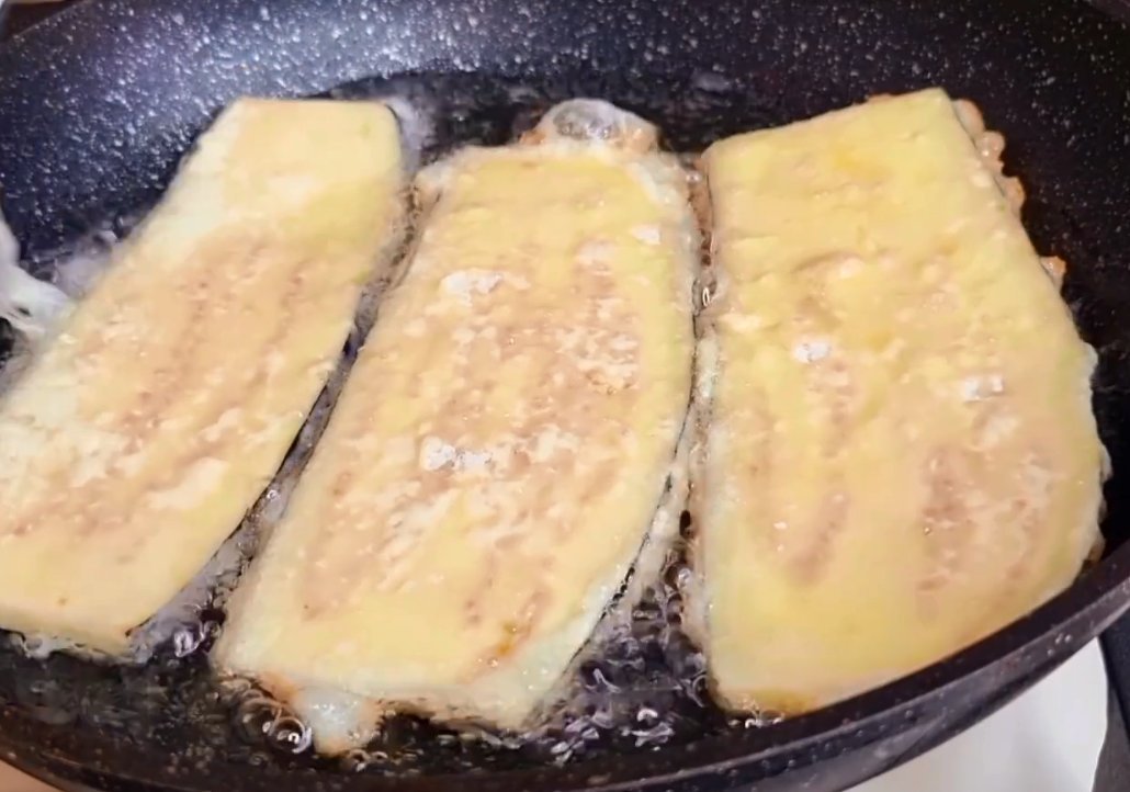 Шаг 6: выкладываем ломтики баклажана в сковороду и обжариваем с двух сторон до золотистой корочки на среднем огне.