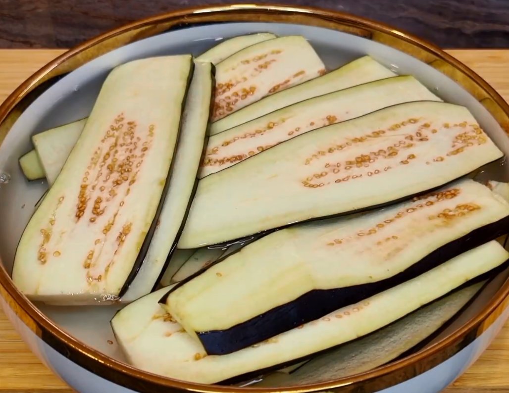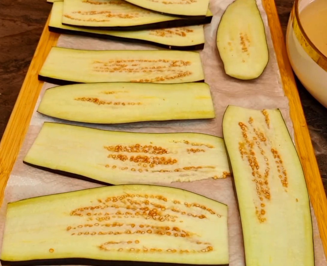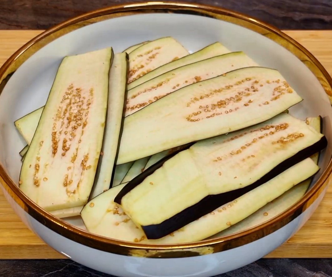 Шаг 1: баклажан нарезать пластинами, как на фото.