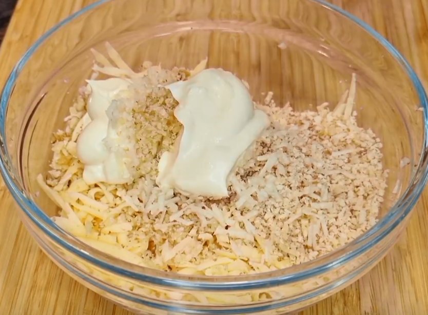 Добавить тёртый грецкий орех (30 гр.), выдавленные зубчики чеснока (2 шт.) и 2 ст. ложки майонеза.