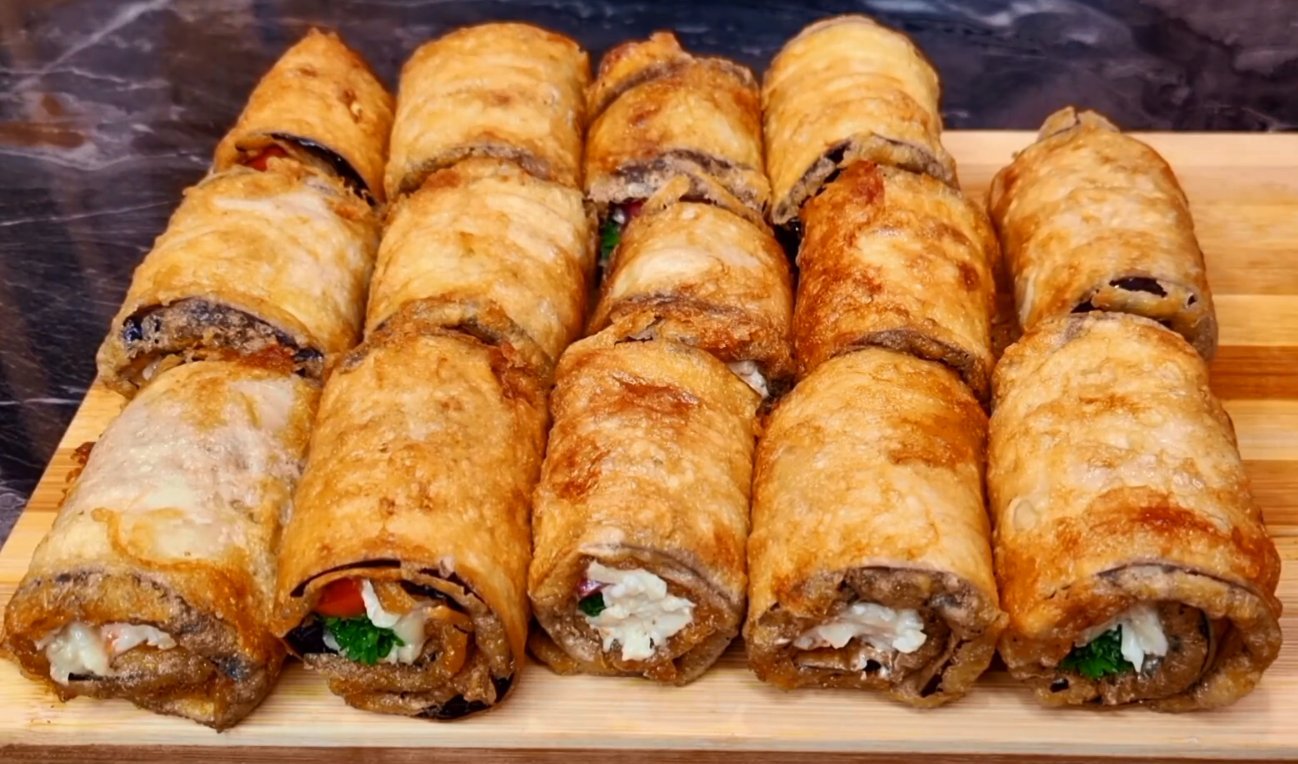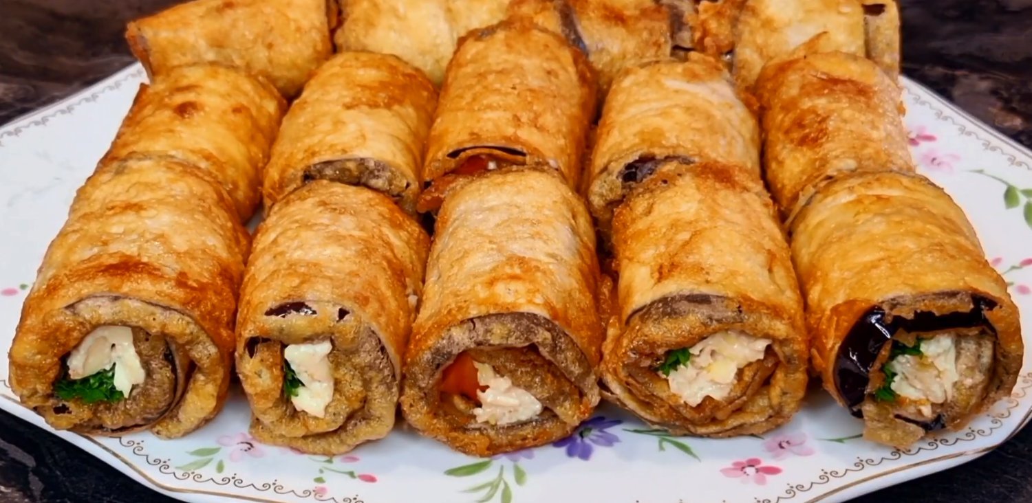 На обжаренный ломтик баклажана кладем 1 ч. ложку сырной смеси, брусочек помидора и листочек петрушки. Сворачиваем в рулет.