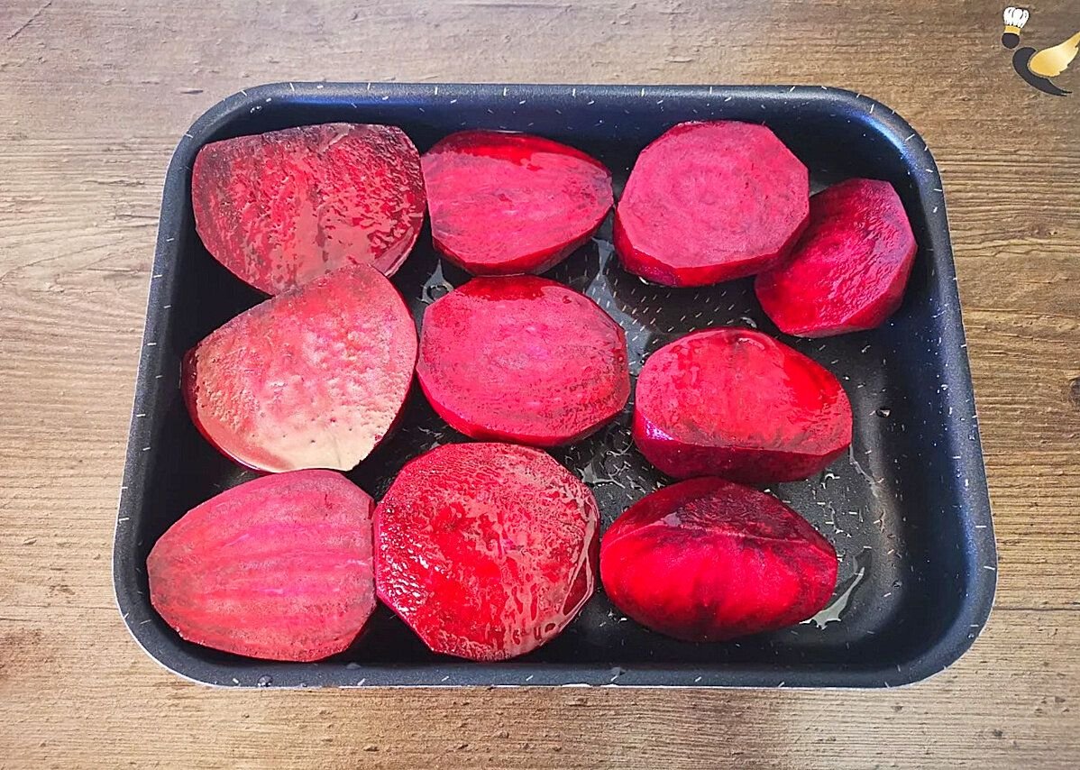 Потом беру совершенно любую форму для запекания, укладываю в нее свеклу и обильно, прям не жалея растительного масла смазываю каждую половинку свеклы.
