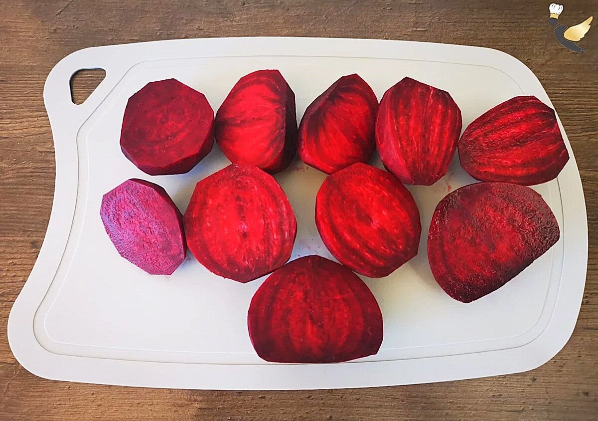 Затем свеклу нужно почистить от кожуры и порезать на пополам, если свекла большая то смело режьте на четыре части.