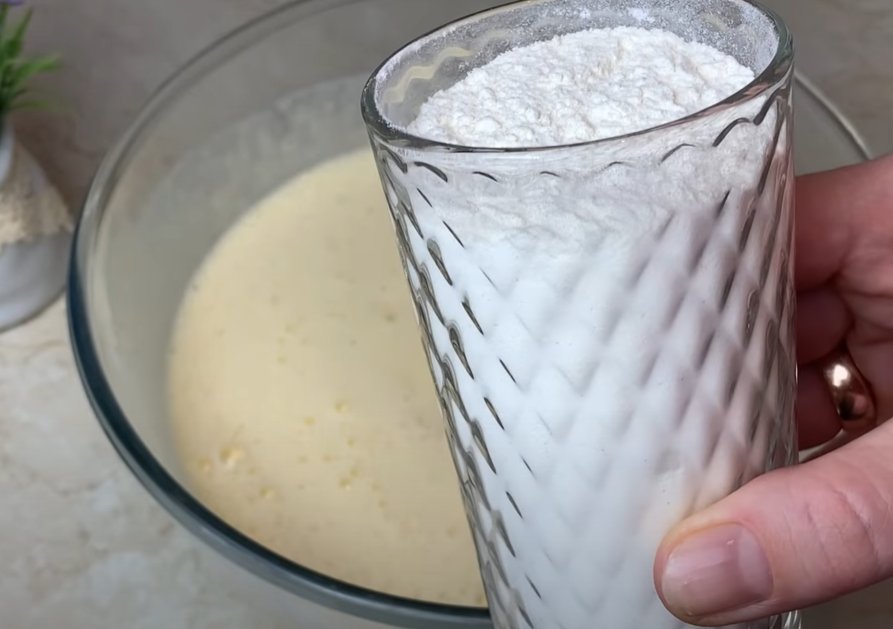 ШАГ 4: Теперь нужно добавить муку. Её просеиваем, предварительно добавив разрыхлитель (или соду).