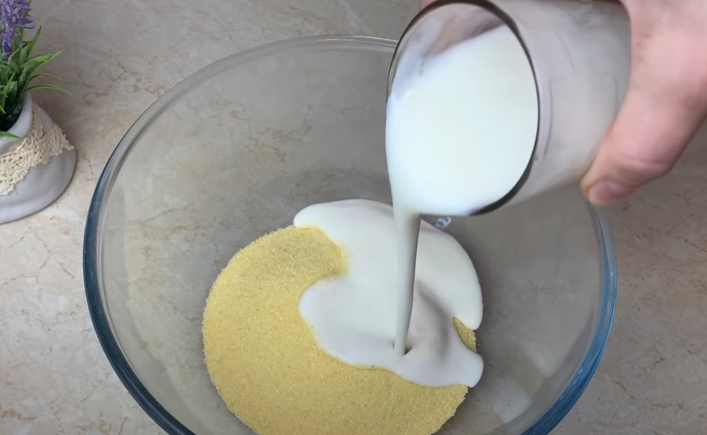 ШАГ 1: Манную крупу заливаем кефиром, перемешиваем и даём ей набухнуть, оставив минут на 20. Кефир, как и все продукты, должен быть комнатной температуры.