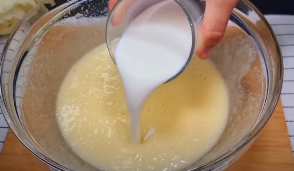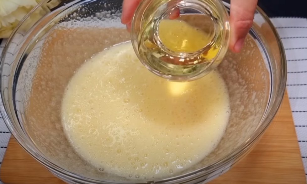 2. Влить растительной масло, перемешать венчиков. Затем влить тёплое молоко и снова перемешать.