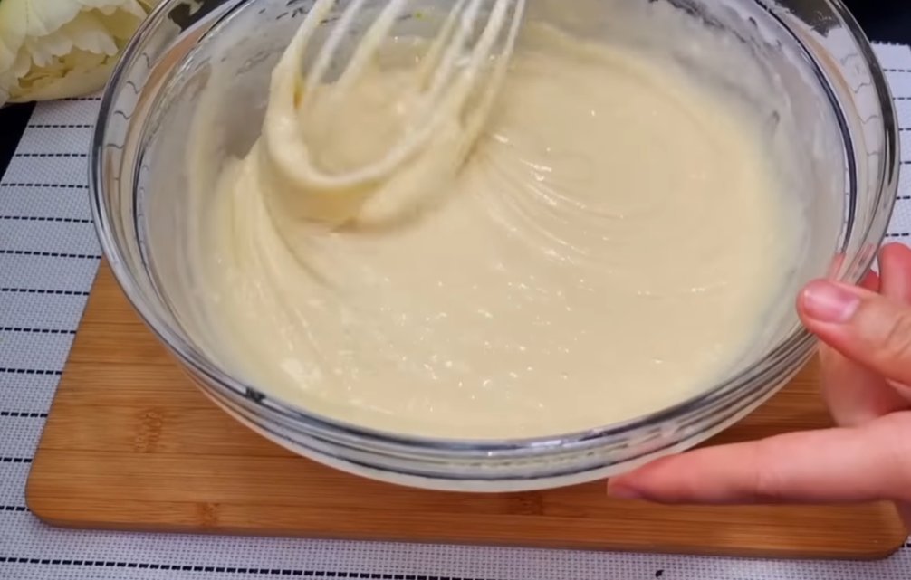3. Добавить муку с разрыхлителем и замесить венчиком тесто. Тесто получается как густая сметана.