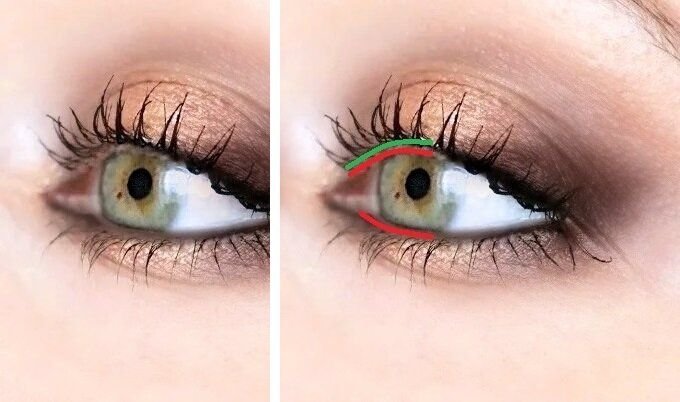 Для наглядности решила показать на своем глазу, чтобы было понятнее. Посмотрите на фото, обратите внимание на линию, откуда растут верхние ресницы (она обозначена зеленым). Вот эту линию и нужно прокрашивать. Верхняя красная линия — это линия, которой стоит избегать, при моргании она соприкасается с водной линией (нижняя красная линия), и если на ней будет пигмент, то он в любом случае отпечатается.