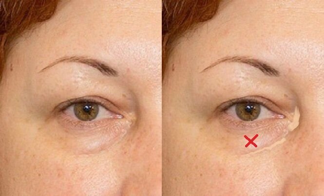 На фото я показала красным крестиком зону, куда растушевывать консилер не нужно.