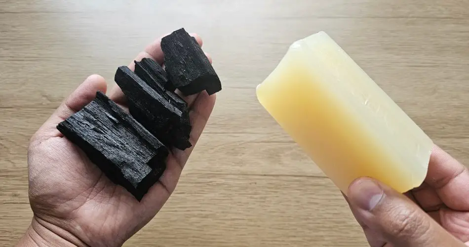 - Смешайте ингредиенты : в миске смешайте глицериновое мыло и древесный уголь. Постепенно добавляйте горячую воду, постоянно помешивая, до получения однородной пасты.