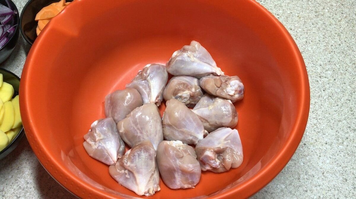 Я в рецепте использую курицу, так же можно взять куриные бедра или голени, что вам больше нравится.