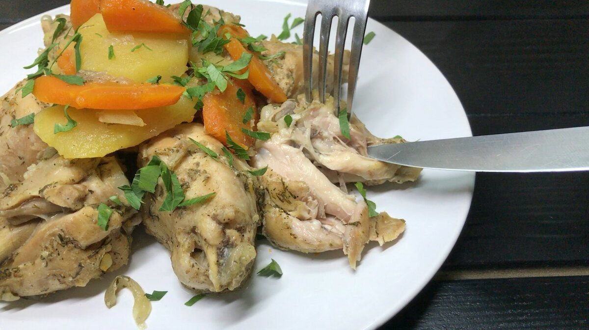 Вынимаю банку, раскладываю курочку с овощами порционно и подаю к столу. Приятного аппетита!