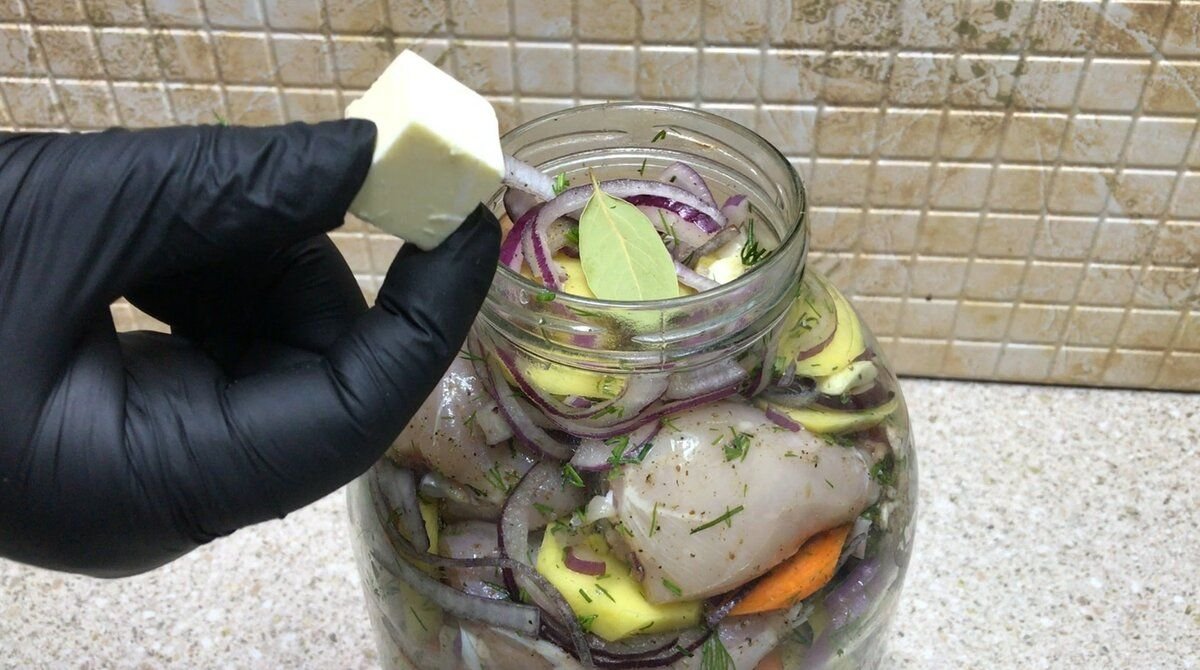 Сверху помещаю кусочек сливочного масла и лавровый лист.