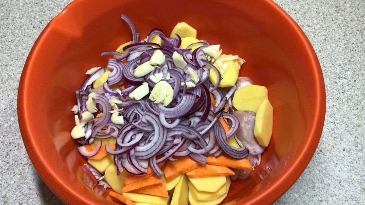 Промываю, очищаю, нарезаю овощи, курицу и перекладываю в миску.