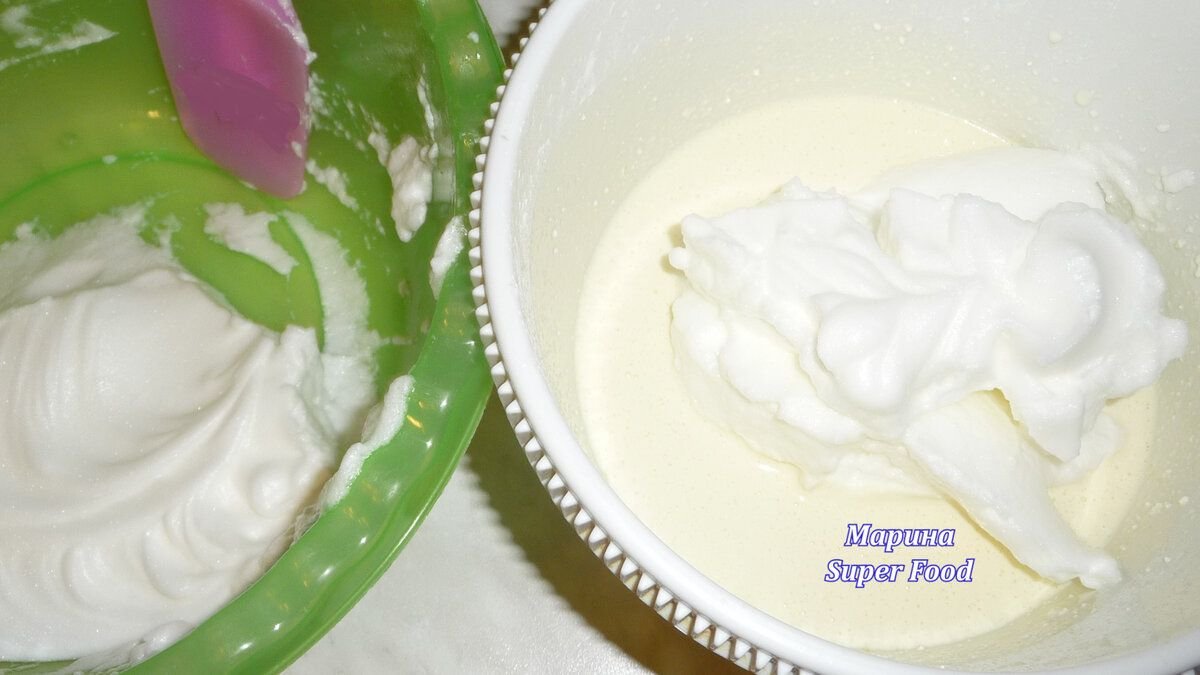 1. Яйца разделяем на белки и желтки. В чаше миксера начинаем взбивать белки на средней скорости до мягких пиков, затем скорость увеличиваем и взбиваем до крепких пиков. Пена должна получиться крепкой и пышной. Перекладываем их в миску и пока отставляем.