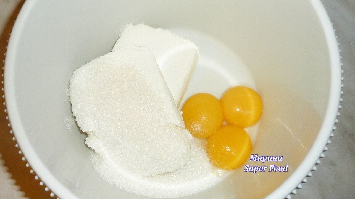 2. Далее будем смешивать все остальные ингредиенты. Желтки и творог помещаем в чашу миксера.