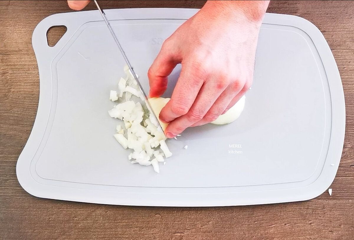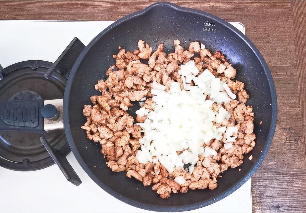 Следом беру одну крупную луковицу и мелко ее шинкую ножом. Лук добавляю к фаршу на сковородку, солю, перчу по вкусу, перемешиваю и обжариваю до золотистого цвета, по времени примерно 10-12 минут, не больше.
