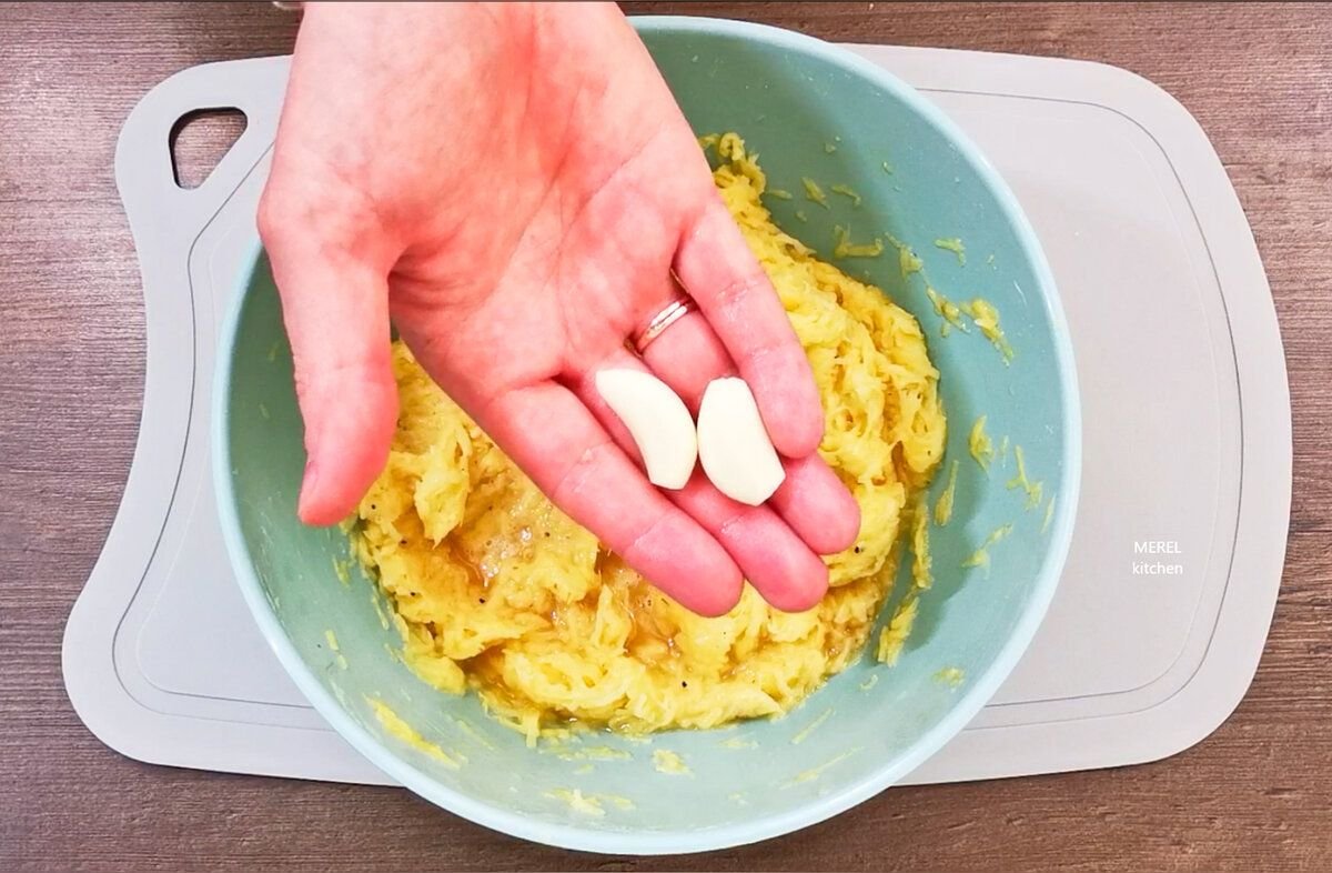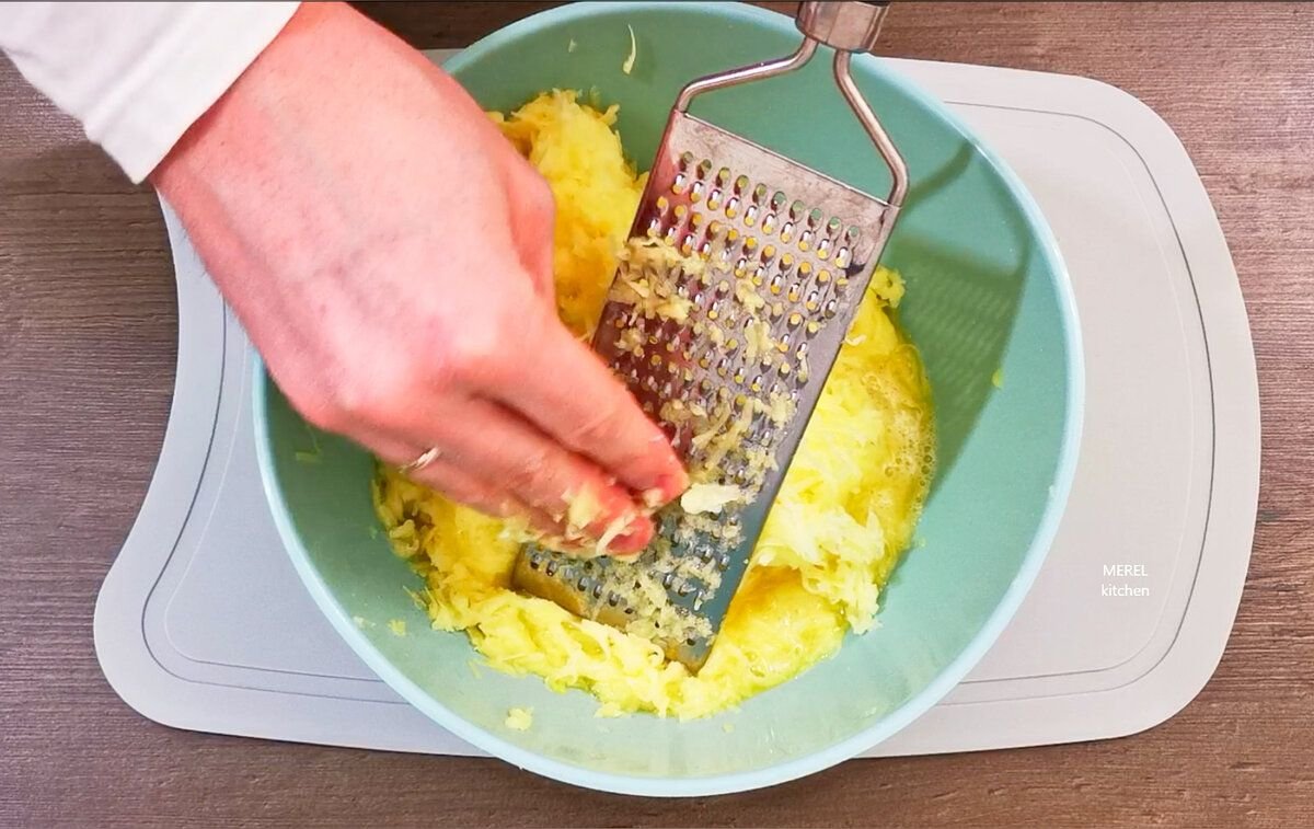 Обязательно добавляю еще пару зубчиков чеснок, которые пропускаю через чеснокодавилку, это придаст зразам особый пикантный вкус и аромат.