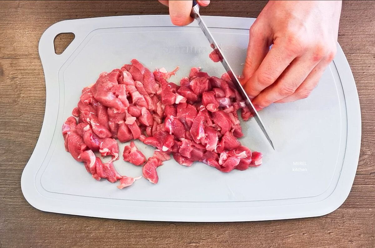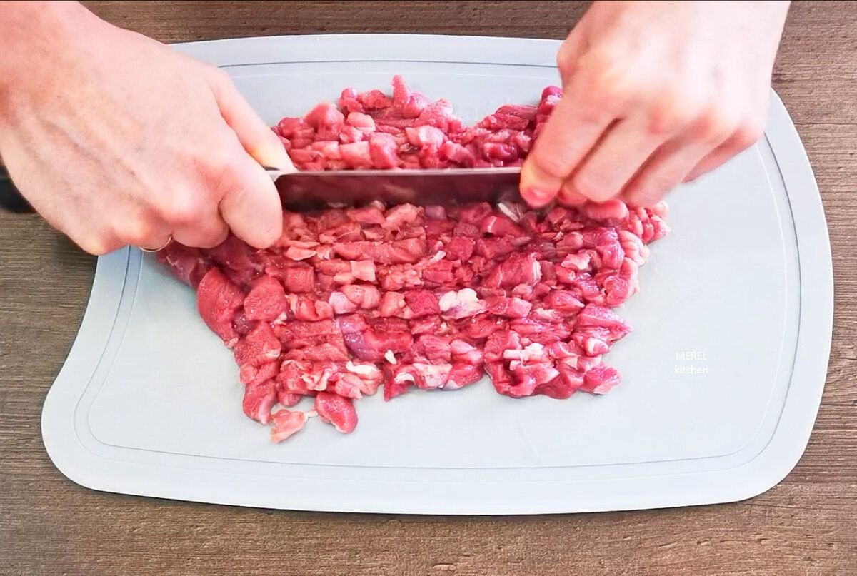 Для зраз я не прокручиваю мясо через мясорубку, а делаю рубленный фарш, мне так больше нравится. Мясо измельчаю ножом.