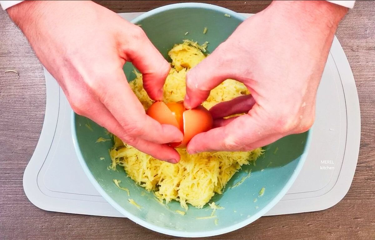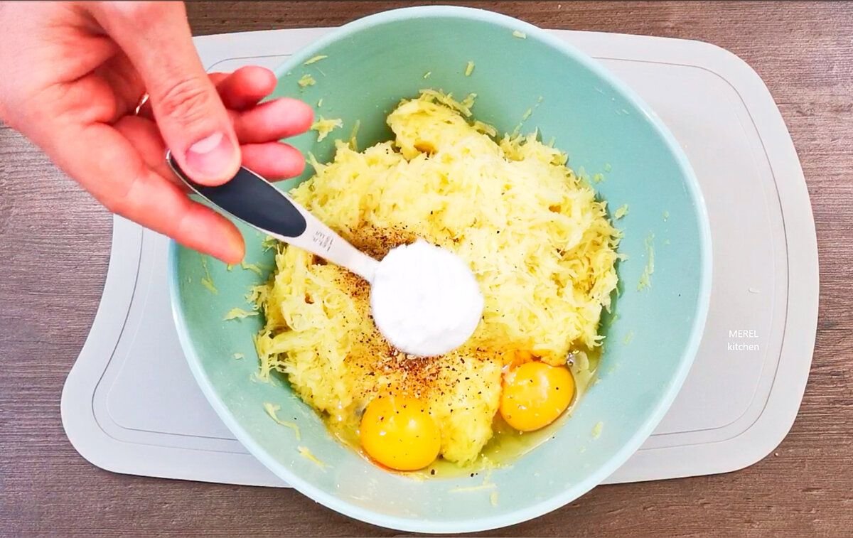 Дальше беру картофель 4-5 крупных клубней. Картошку чищу и натираю на терке, обязательно на мелкой, тогда зразы буду нежными и пышными. Натертый картофель нужно немного присолить, чтобы он пустил сок, который нужно очень хорошо отжать.