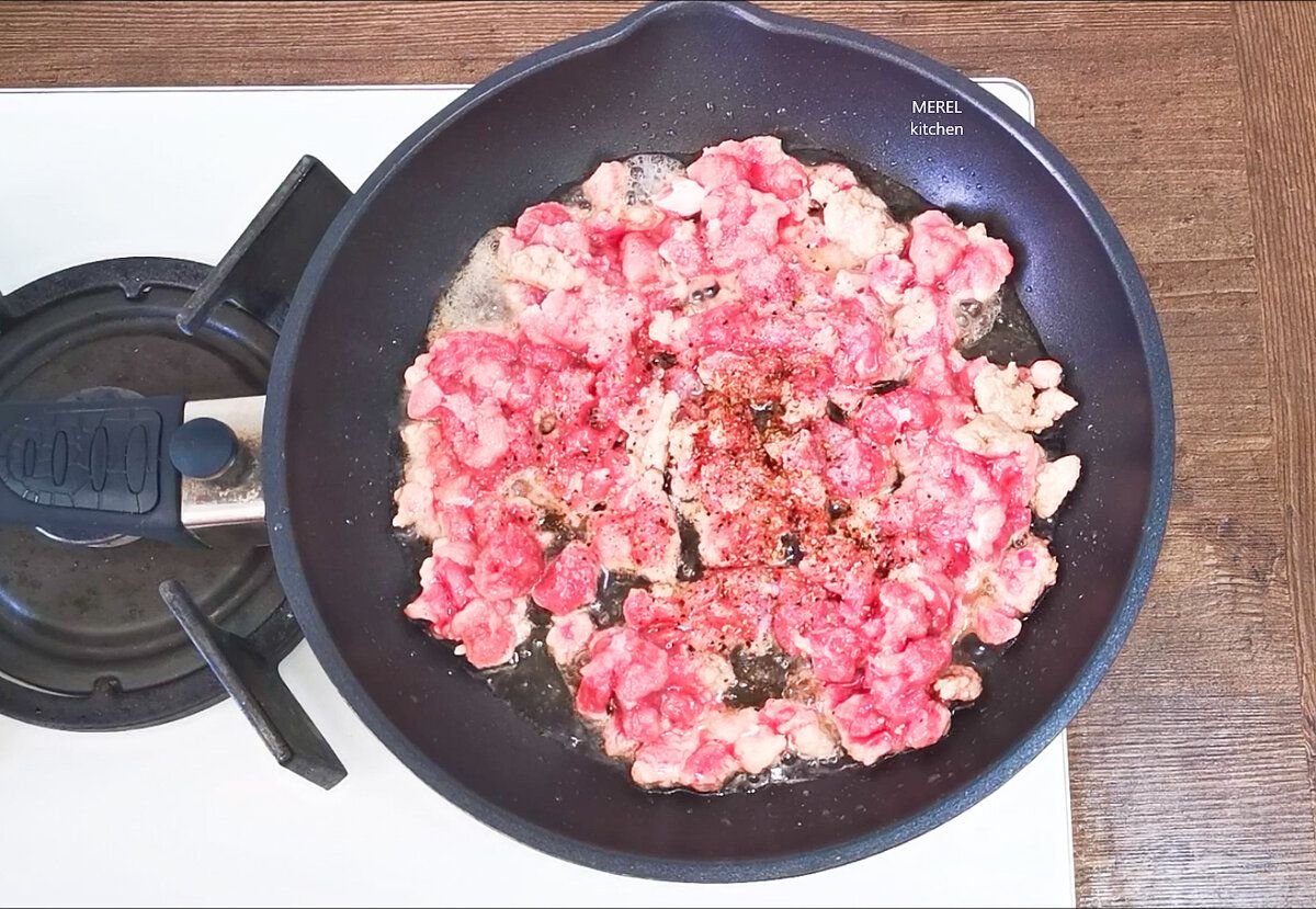Затем на сковородке разогреваю растительное масло и отправляю обжариваться фарш, его нужно слегка прижарить, чтобы выпарилась влага.
