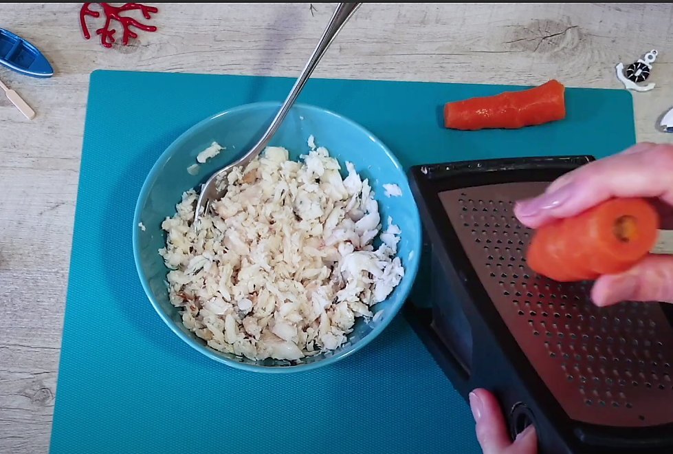 Отварную морковь натираем на терке и добавляем к рыбе.