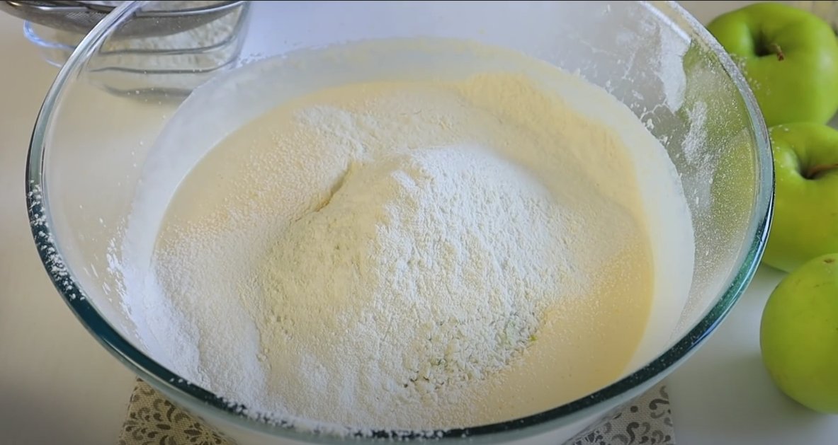 Просеиваю муку с разрыхлителем. Делаю это в 2 этапа, осторожно вымешивая тесто.
