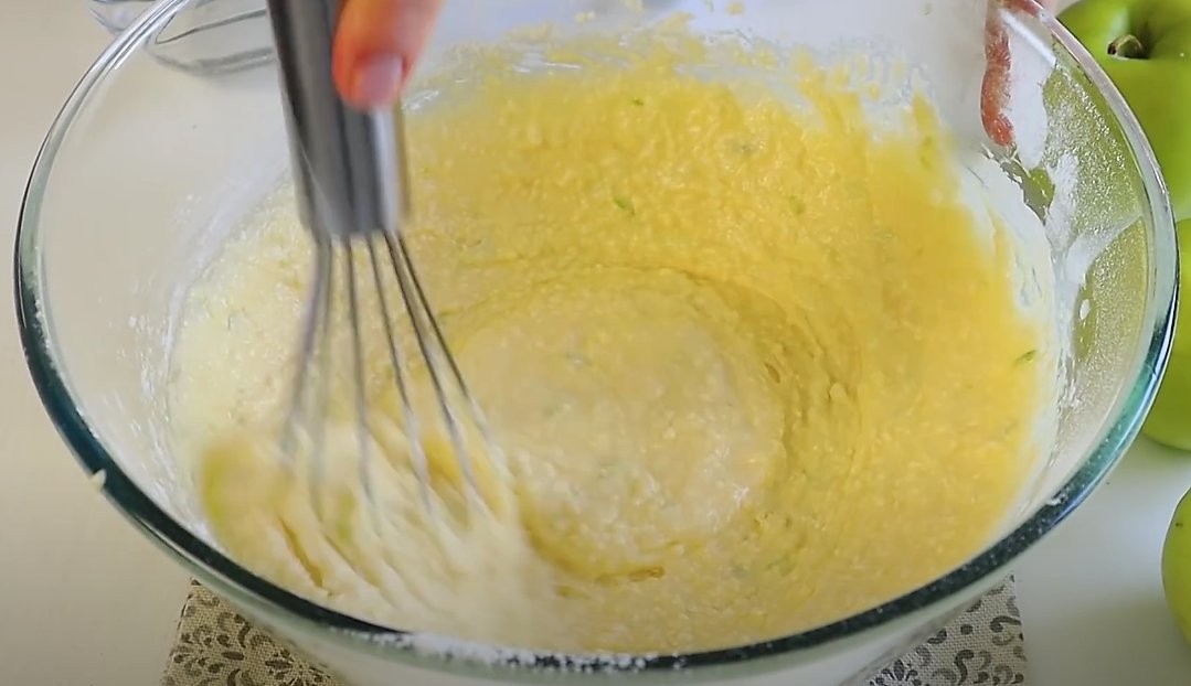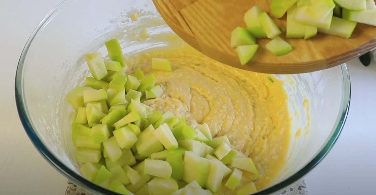 Яблоки (у меня сорт Гренни) режу на мелкие кубики и добавляю в тесто.