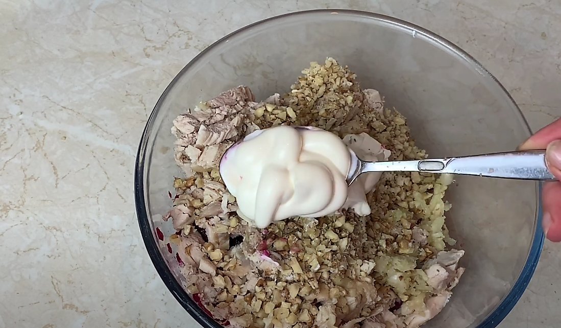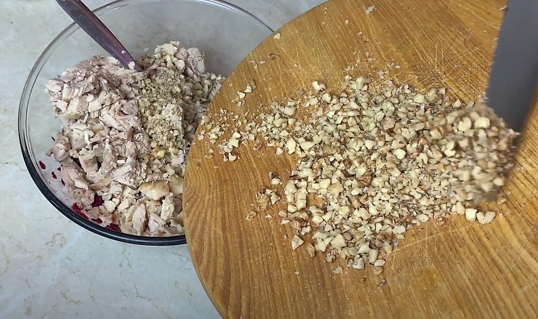 Следующий ингредиент — грецкие орехи, примерно 55 гр. Их я мелко рублю ножом.