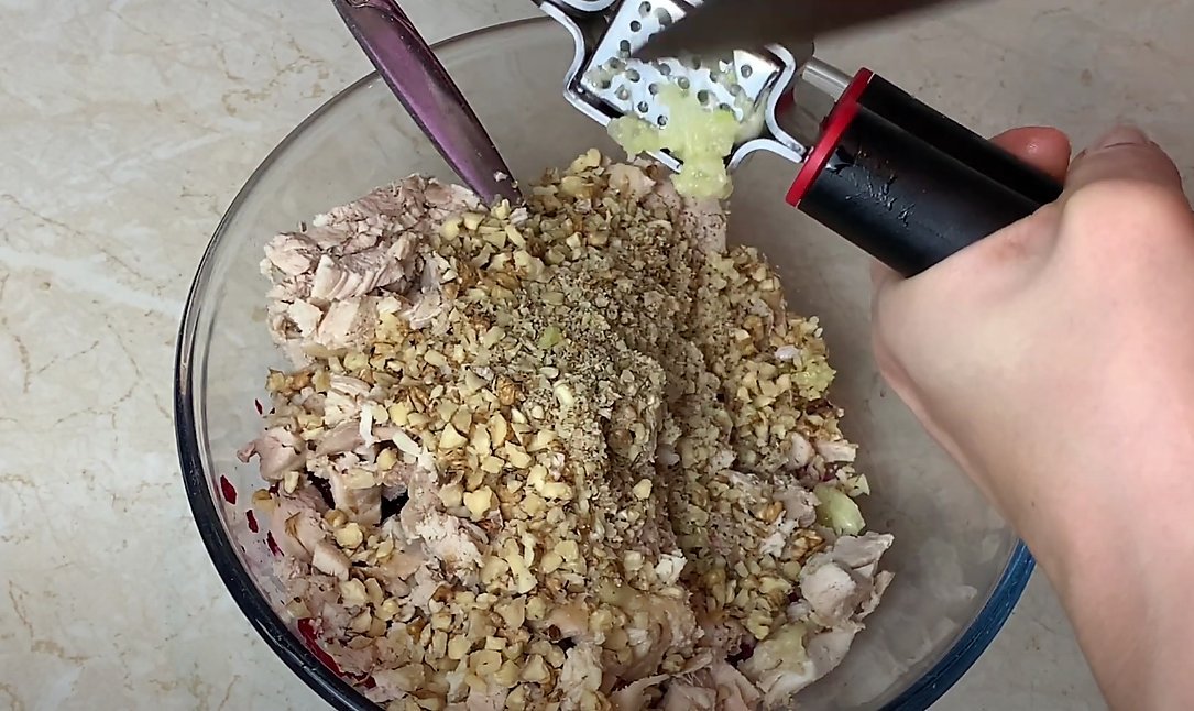 Теперь пришла очередь чеснока — я возьму 2 зубочка и пропускаю через пресс. Можно порубить ножом, если любите,чтобы в салате попадались мелкие кусочки чеснока.