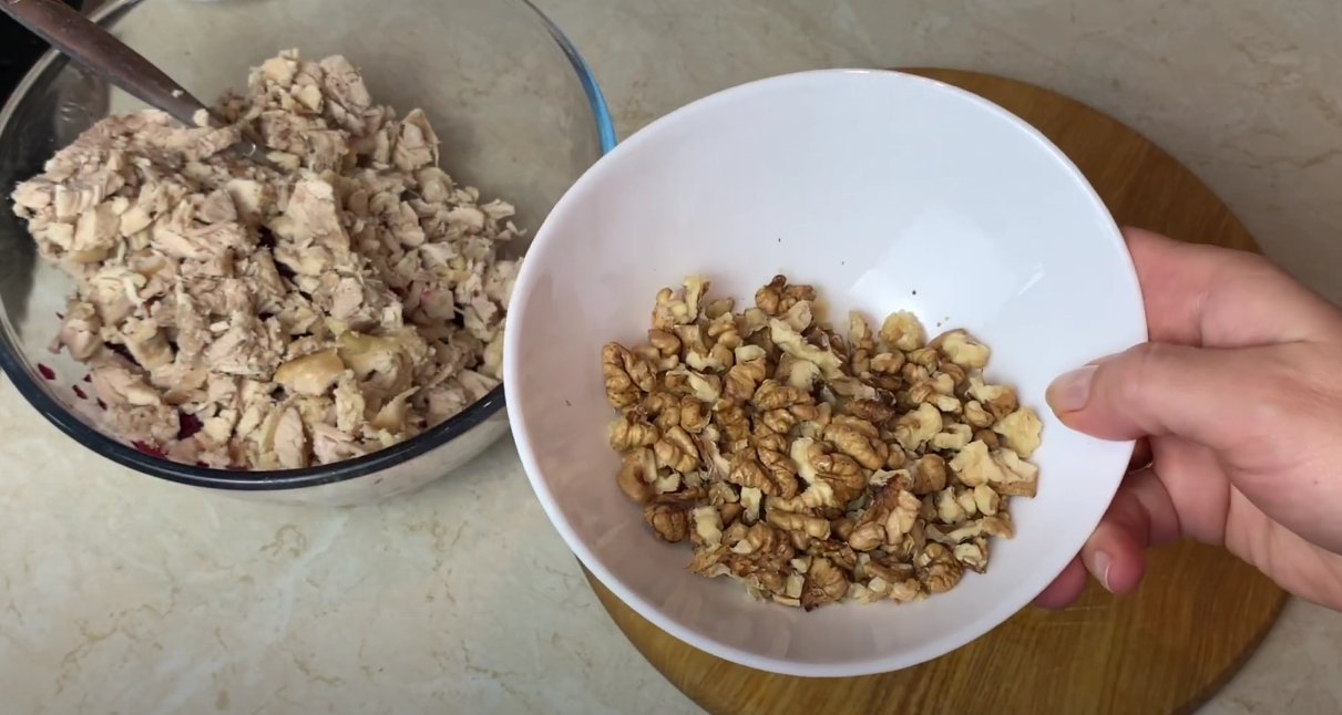 Вареную курочку я режу на небольшие кусочки и отправляю ее к свекле.