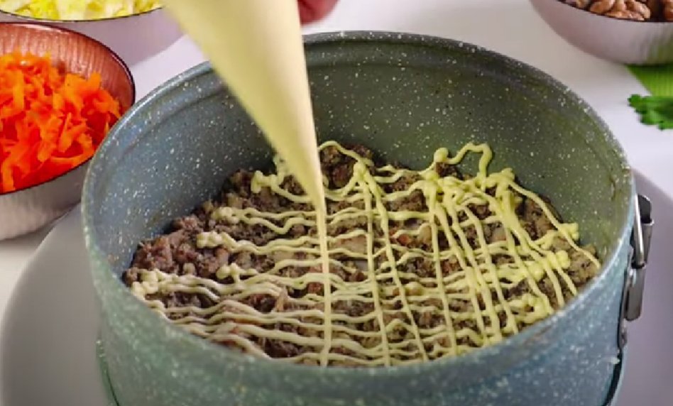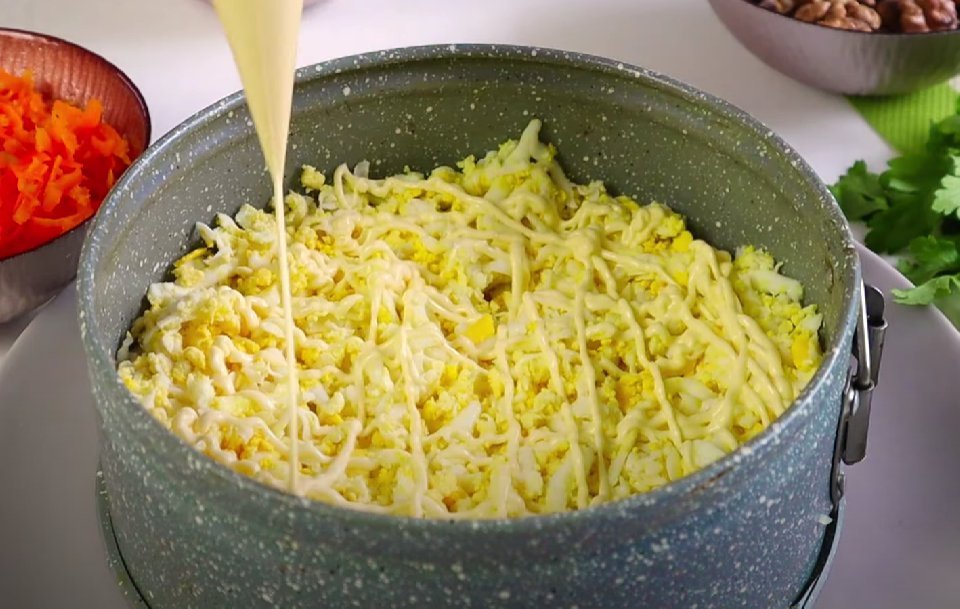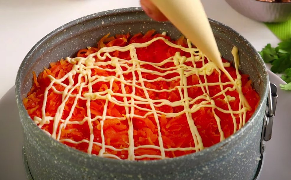 ШАГ 5: Следующий слой — отварная морковь. Её тоже натираем на мелкой терке. Майонезная сетка.