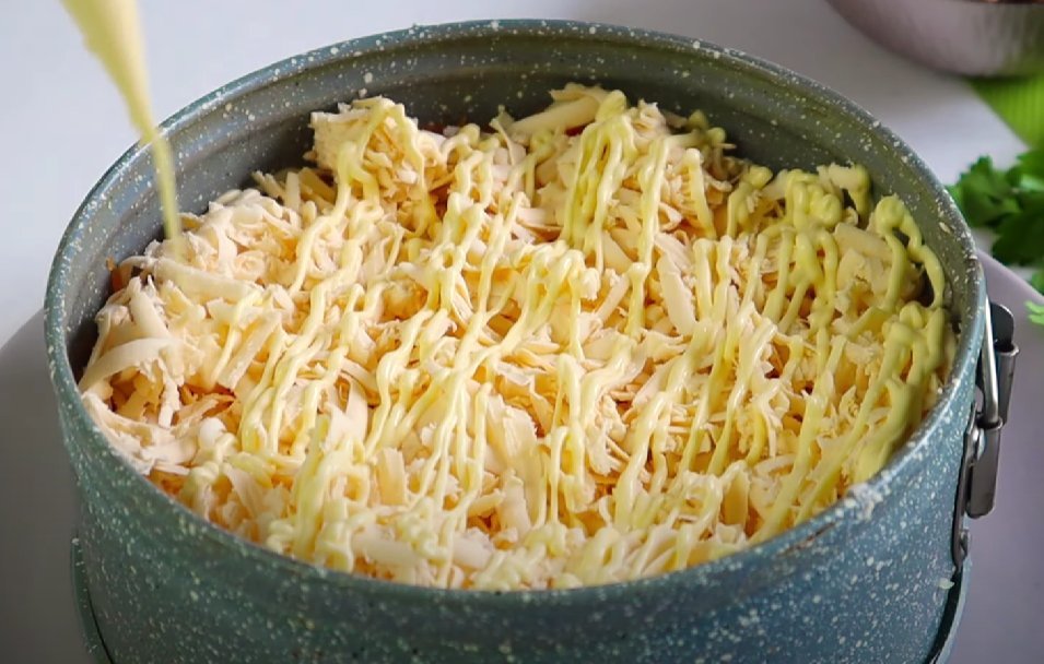 ШАГ 6: Верхним слоем послужат плавленные сырки. Их нужно немного подморозить и тоже натереть на терке. Берите сыр, а не сырный продукт. Сверху добавляем немного майонеза.