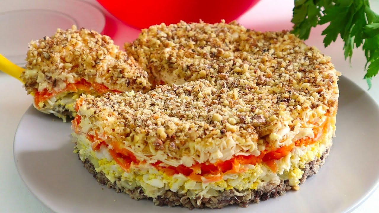 ШАГ 7: Посыпаем салат дроблеными грецкими орехами и даем ему настояться пару часов.