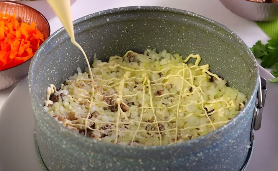ШАГ 3: Репчатый лук нарезаем очень мелко и выкладываем вторым слоем. Майонезная сетка.