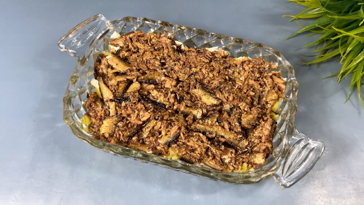 2. Берем шпроты, сливаем из них масло, измельчаем вилкой, выкладываем ровным слоем на картофель и смазываем майонезом.