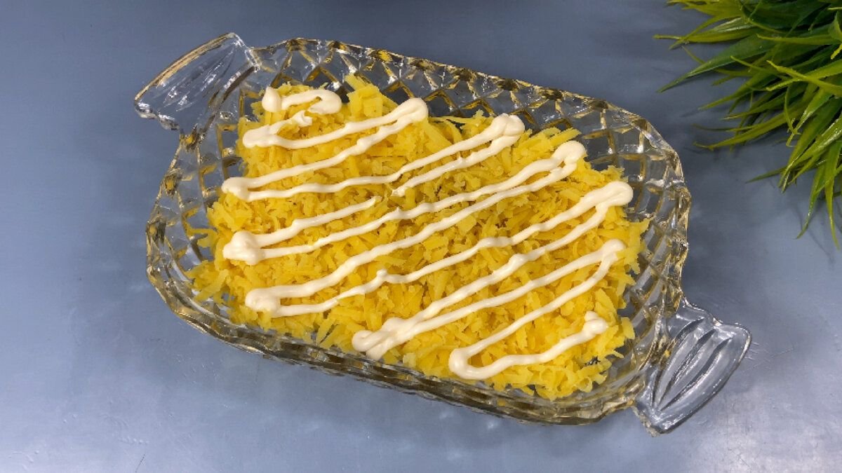 1. На дно блюда для салатов предварительно смазанное майонезом выкладываем ровным слоем мелко нарезанный или натертый на терке отварной картофель и смазываем его майонезом.