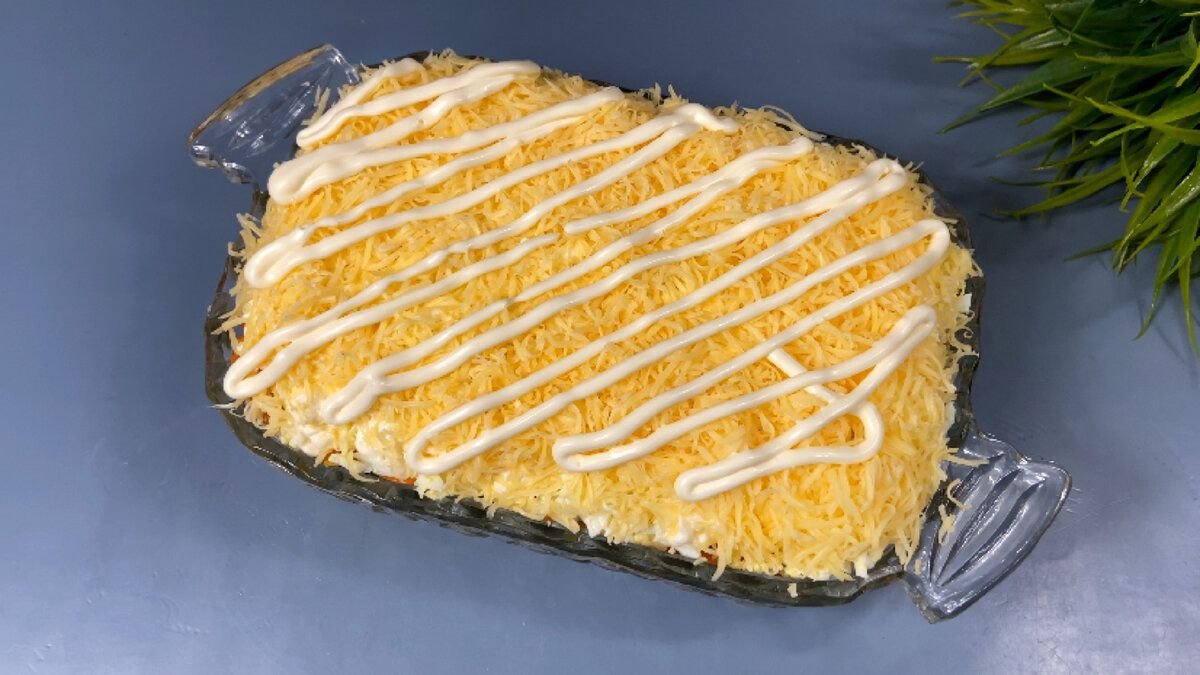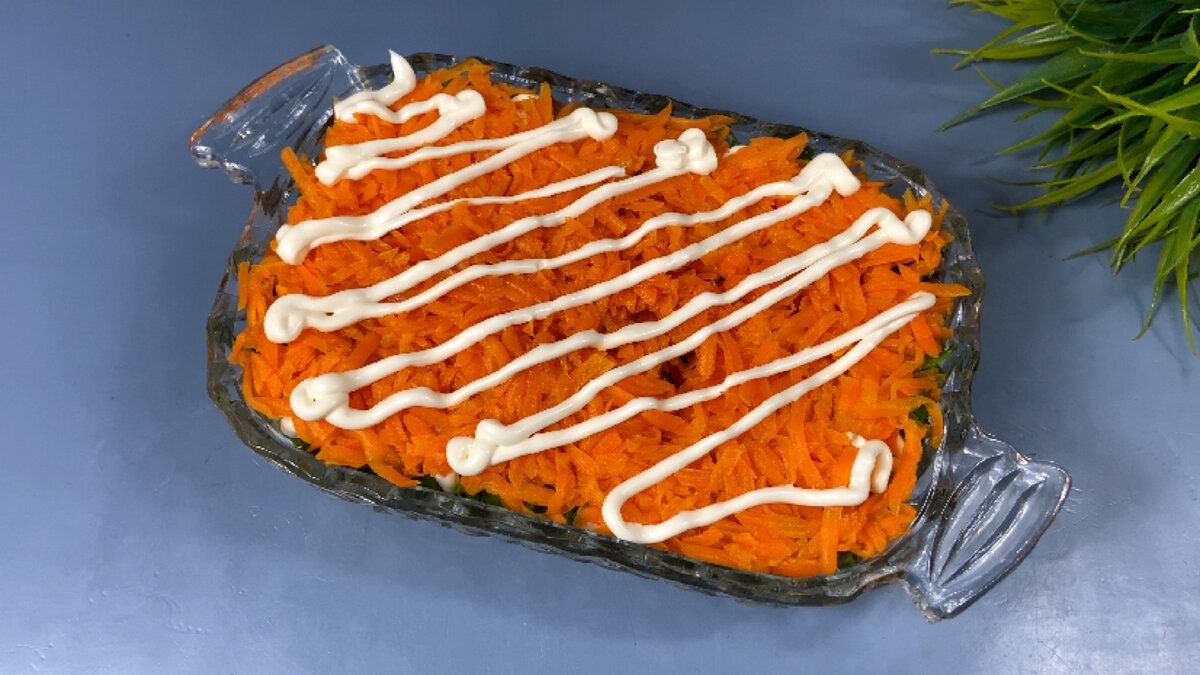 4. Следующим слоем идет отварная морковь натертая на крупной терке, затем измельченные вареные яйца и далее сыр натертый на мелкой терке. Также не забываем каждый слой смазывать майонезом.