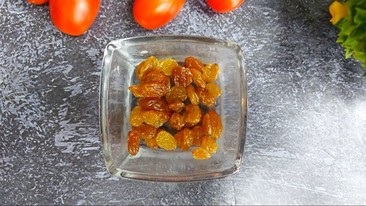 Изюм замачиваем в кипятке, ждём 5 минут. Затем его нужно обсушить с помощью бумажного полотенца.