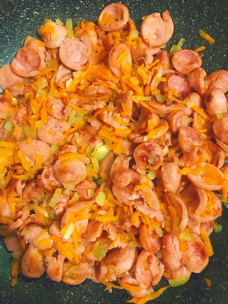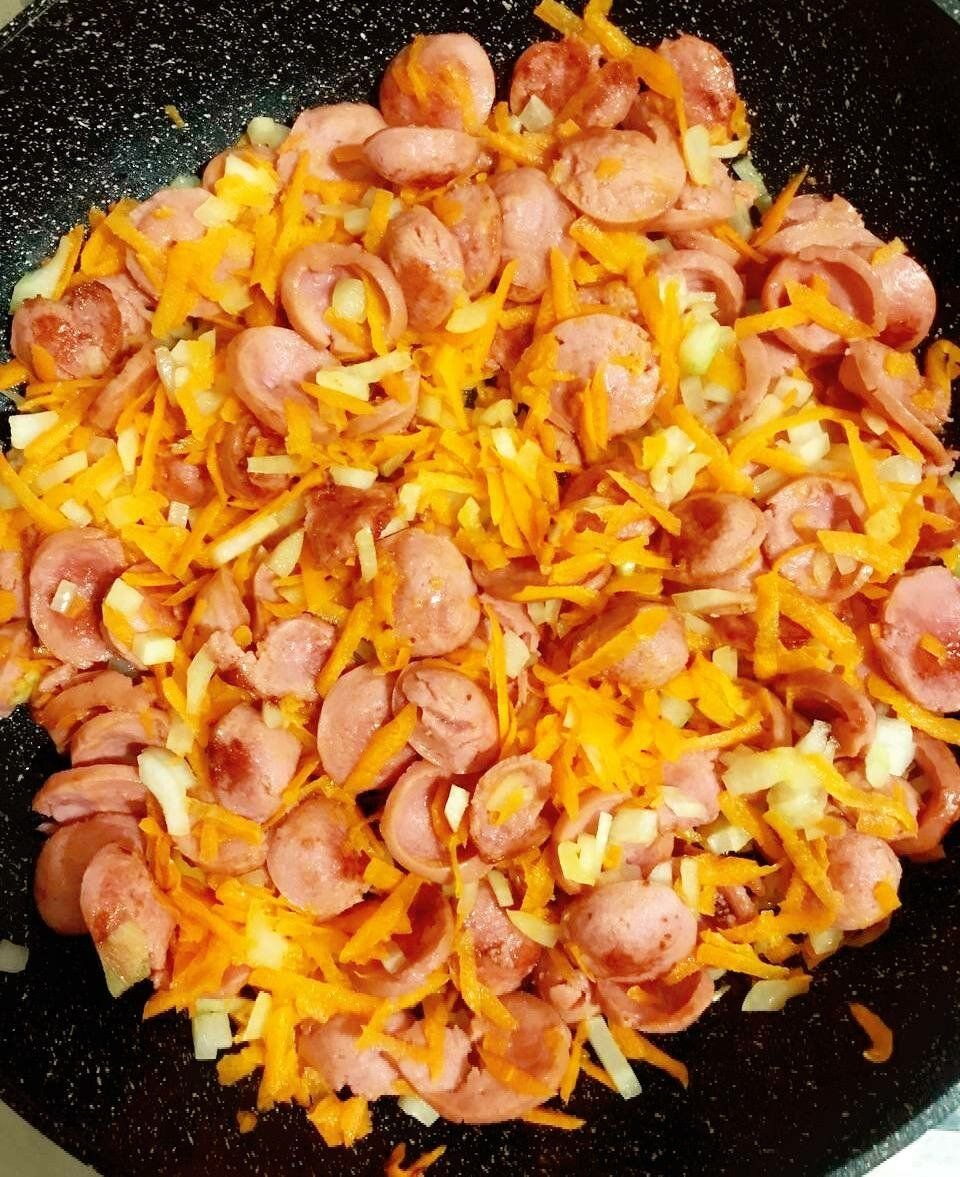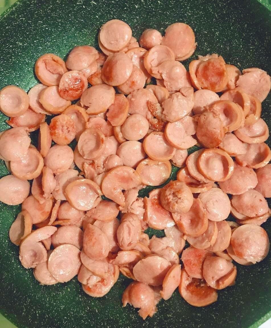 4. Добавляем их к сосискам.