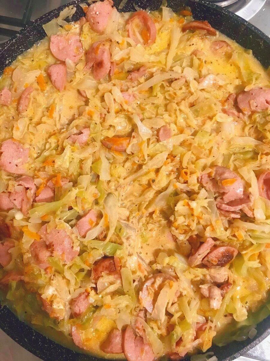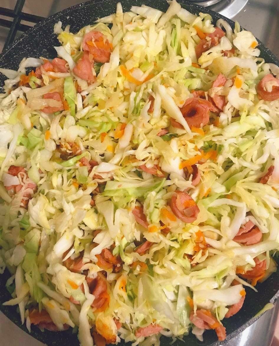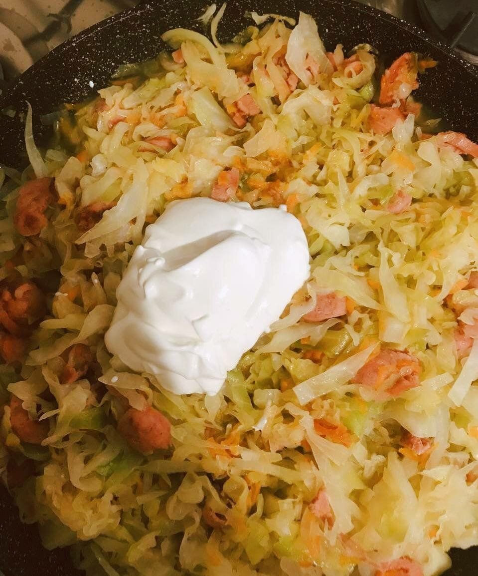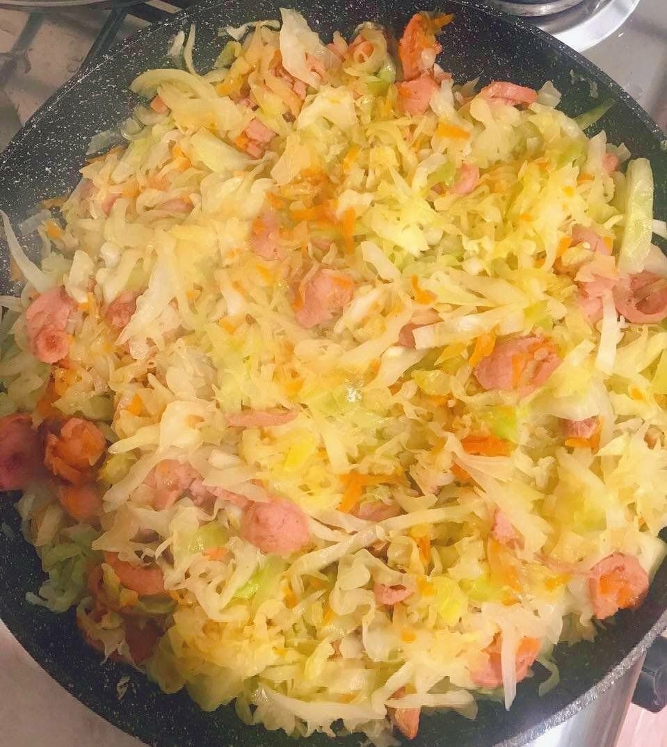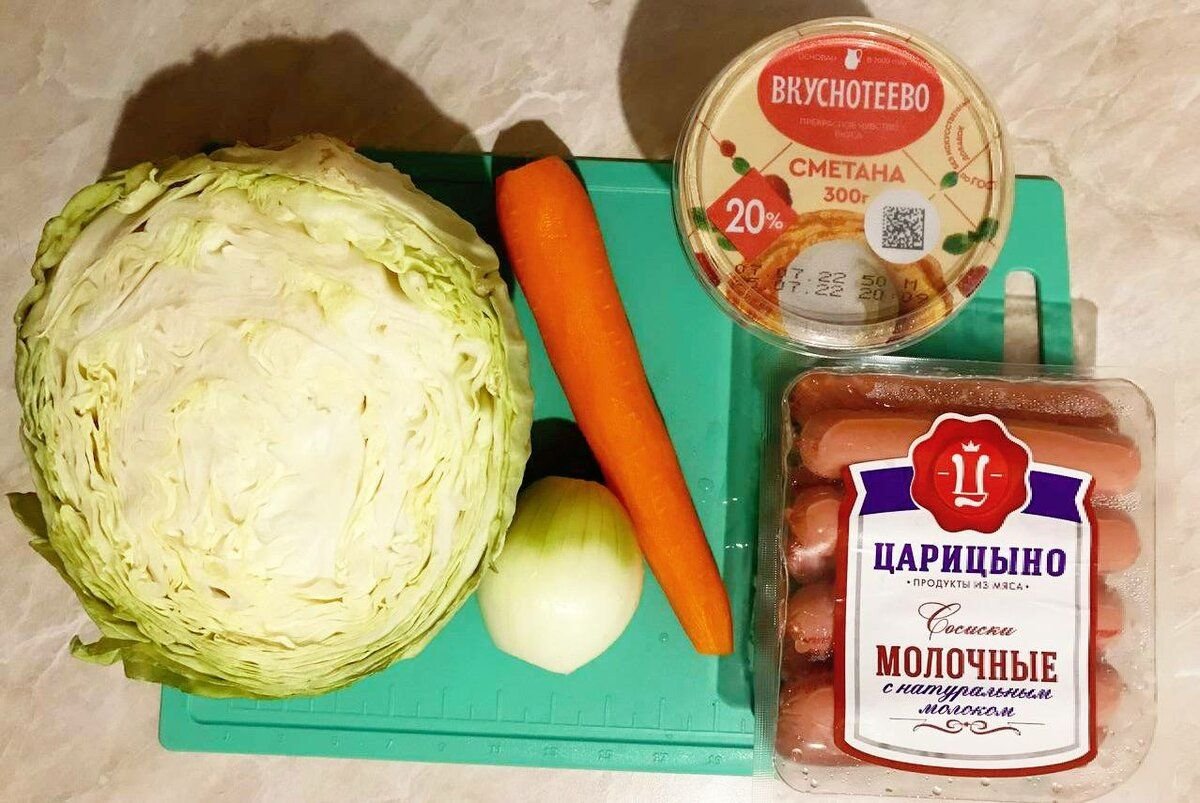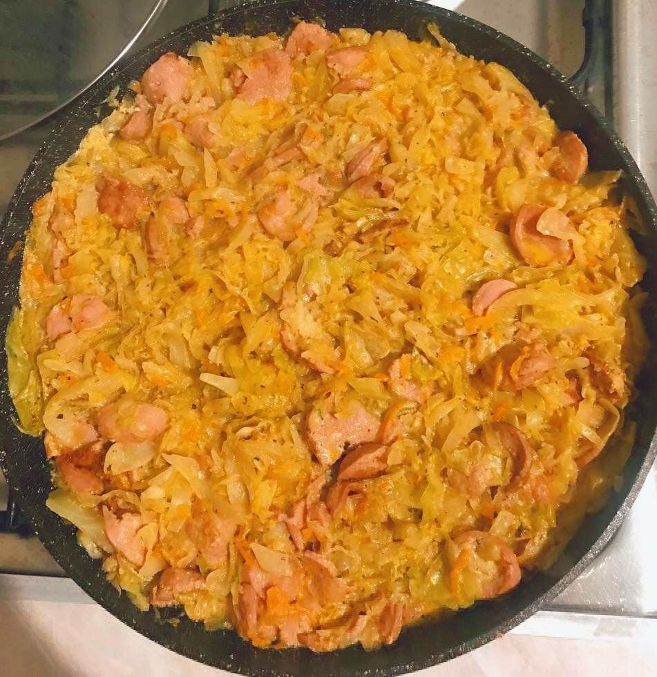 Сегодня так захотелось тушёной капусты, что я не смогла себе отказать и пошла её готовить. И в добавок к этому, заглянув в холодильник я наткнулась на пачку сосисок, которые решила также использовать для приготовления. С сосисками капуста получается более нежной и сочной, и в итоге выходит полноценное блюдо, а не гарнир.