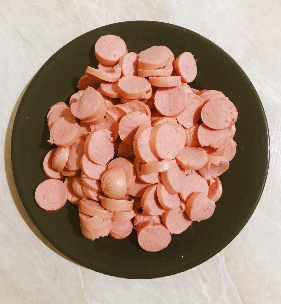 1. Сосиски надо очистить и нарезать на кругляшки.