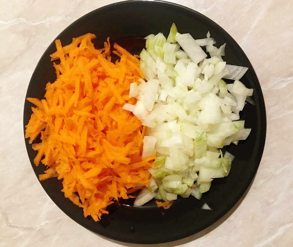 3. Луковицу мелко нарезать, морковь натереть на терке.