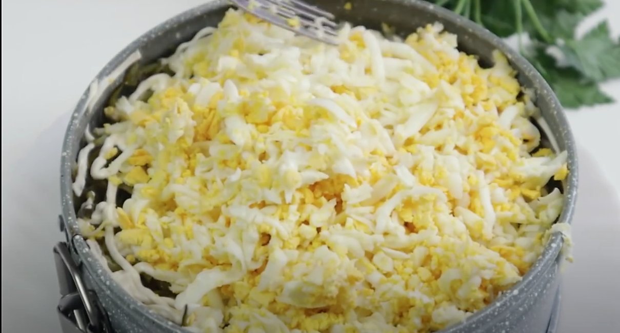 6 слой: Выкладываем натертое яйцо заключительным слоем.